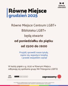 Grudzień w Równym Miejscu W grudniu nie odpuszczamy. Mamy dla Was pełen miesiąc aktywności! Zapraszamy również do korzystania z naszej Biblioteki LGBTQ+! Jest dla Was otwarta